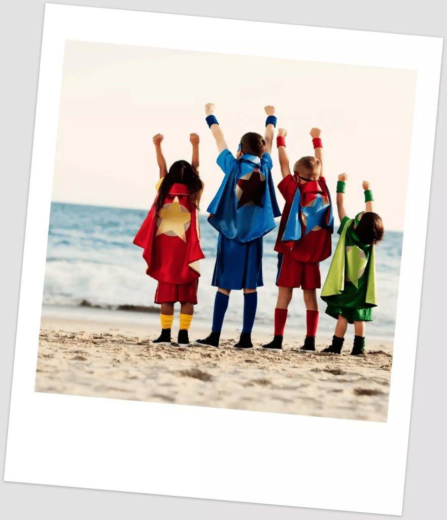 Este sitio es tan diver que los únicos niños que hay son los que yo quiero que estén. He traído a mis amigos Berto, el gordito, a Nerina la miope, a Demi que es Down, a Max que va en una silla de ruedas e Iriana que es tartamuda. Los niños del cole también se meten con ellos porque son diferentes como yo. En mis sueños los he convertido en los Distintoamigos, el mejor grupo de súper héroes del Universo. Aunque he de reconocer que he sido un poco egoísta, me he puesto como líder del equipo y me he quedado con el mejor traje de todos. ¡Qué bien me lo paso!